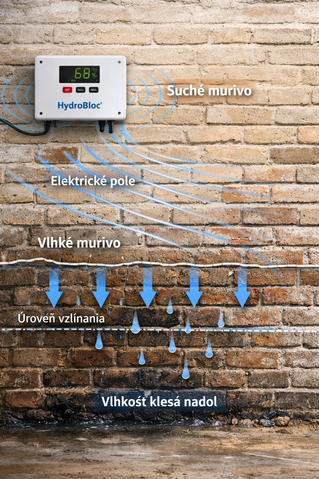 HydroBloc je pokročilý systém na odvlhčovanie múrov založený na modernej elektrofyzikálnej technológii, ktorý účinne a trvalo eliminuje problém vlhkých stien bez potreby chemických látok, hlučnej demolačnej práce či komplikovaných stavebných zásahov.